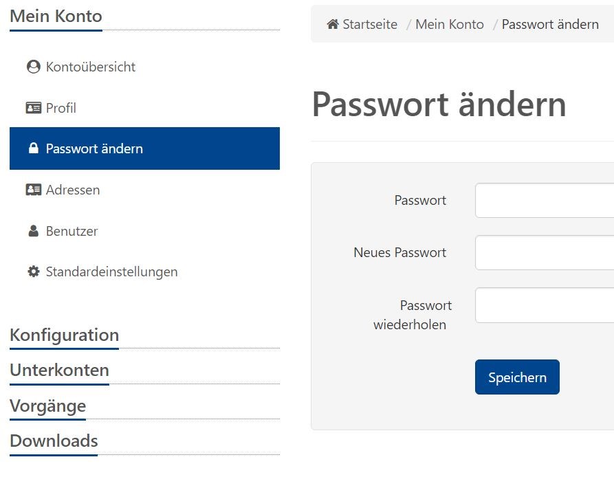 Sie gelangen dann auf die Kontoübersichtsseite. Dort können Sie links über den Menüpunkt Passwort ändern Ihr Passwort neu setzen.